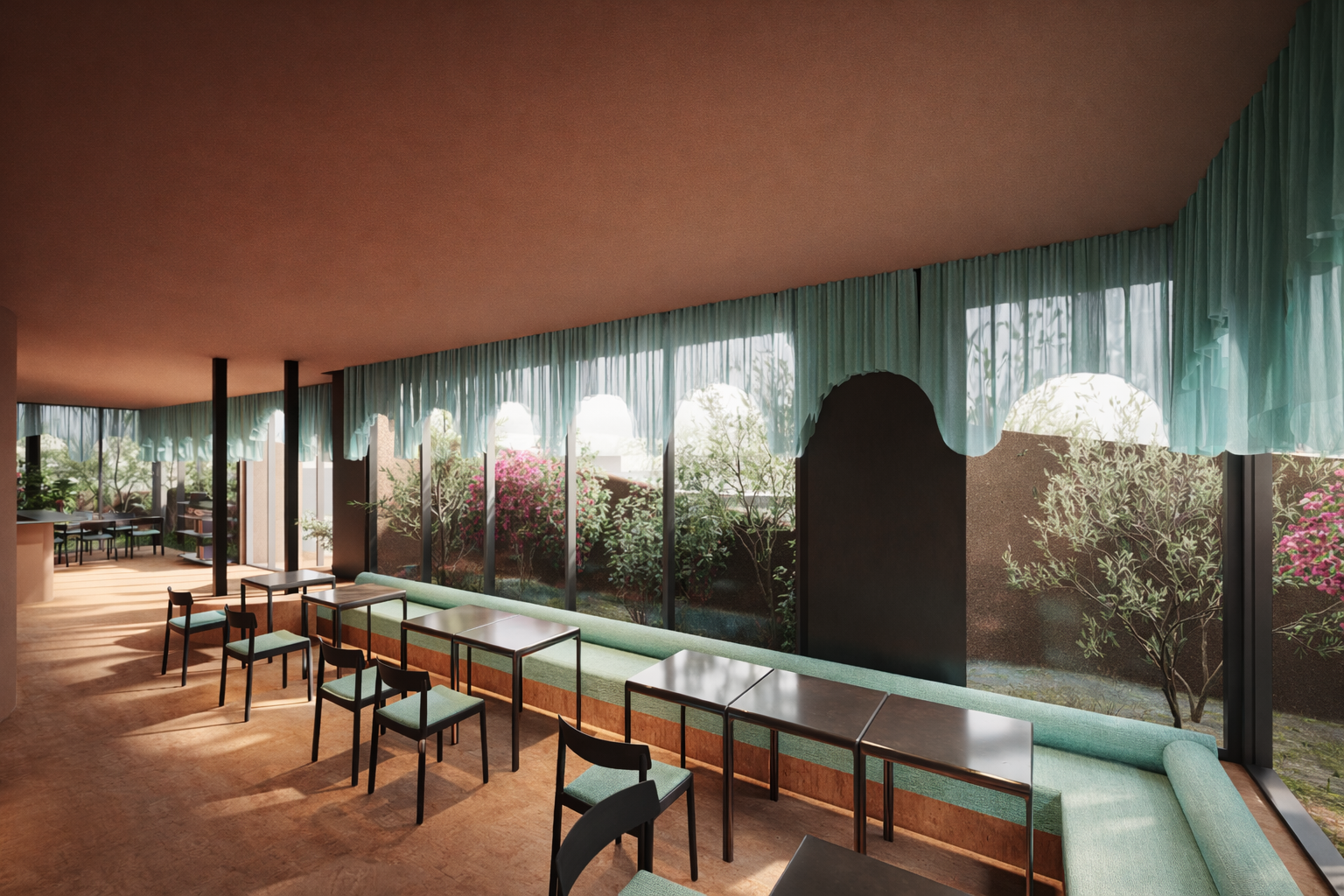 窓まわりは既存サッシのリズムに合わせて、波や砂紋を想起させる半円のモチーフで窓面を象り、曲面壁と植栽帯を重ね合わせることで、建物前面に広がる大きな道路や駐車場に対して複数の境界面を介して距離を取ります。