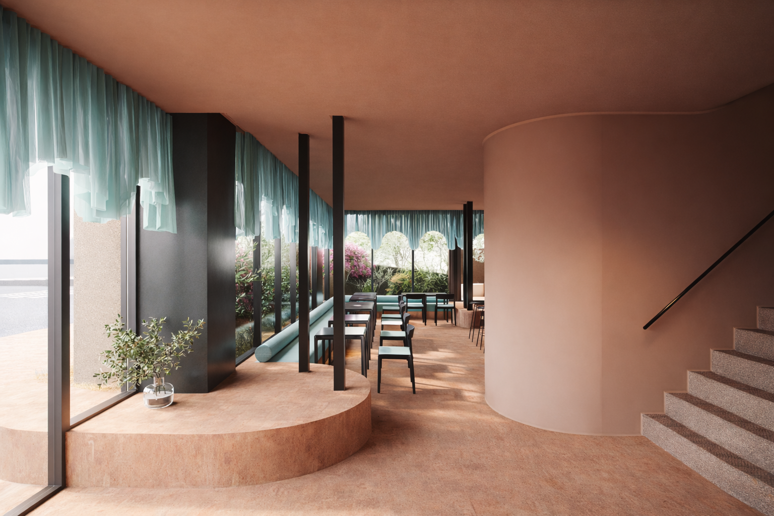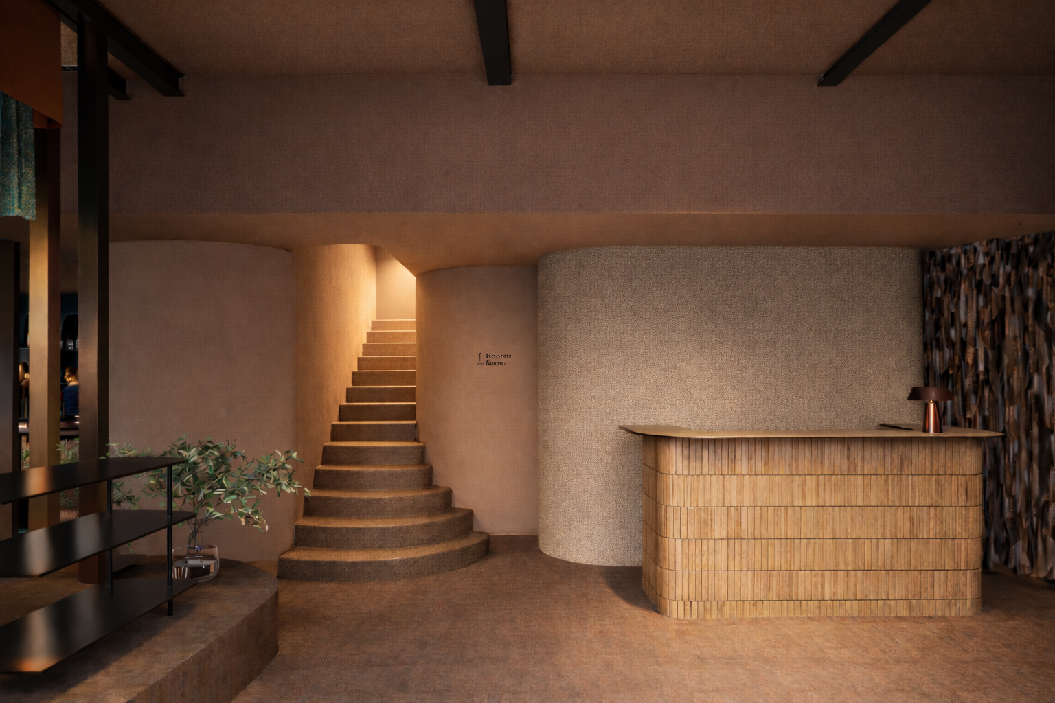 円形に折り曲げられた壁がゲストを奥に誘う、砂漠のオアシスに迷い込んだような穏やかな空間を目指しています。