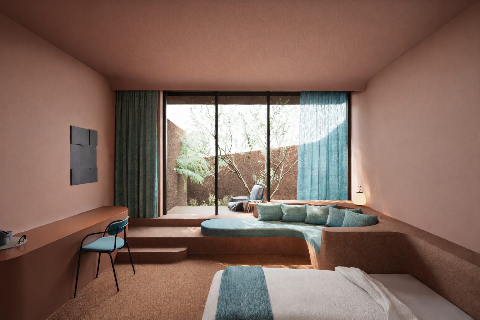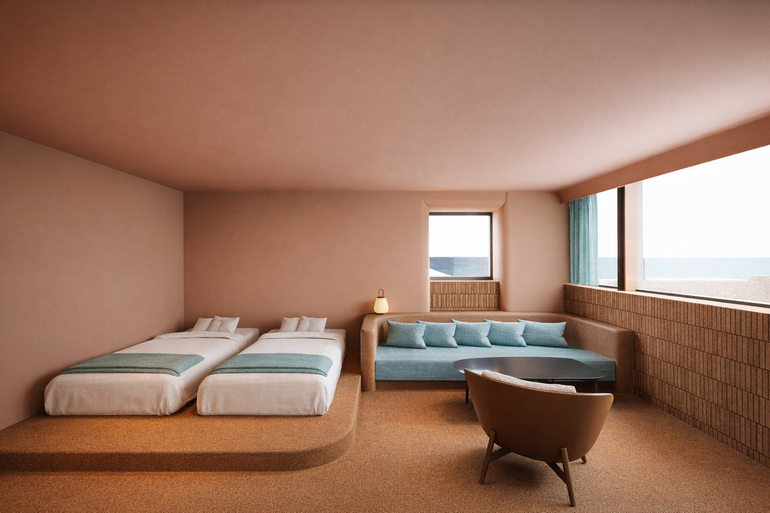 客室には、砂丘を歩く感覚を喚起する砂紋モチーフのカーペットを敷き、砂が隆起したような角のない造形で家具を構成。黒いアーチ窓とターコイズブルーのファブリックは、鳥取の民藝「牛の戸焼き」の色彩を参照し、砂漠の邸宅のような非日常性と、鳥取とのつながりを感じさせる落ち着きを両立させています。