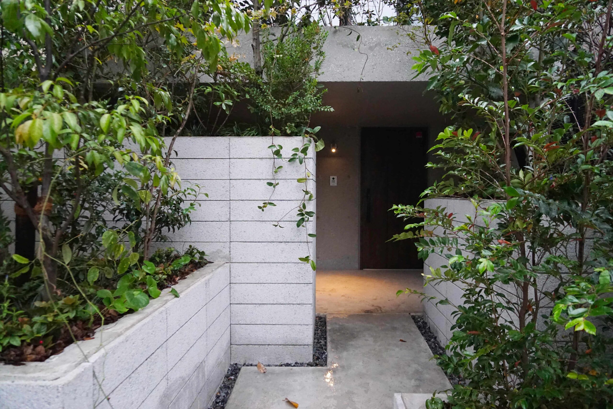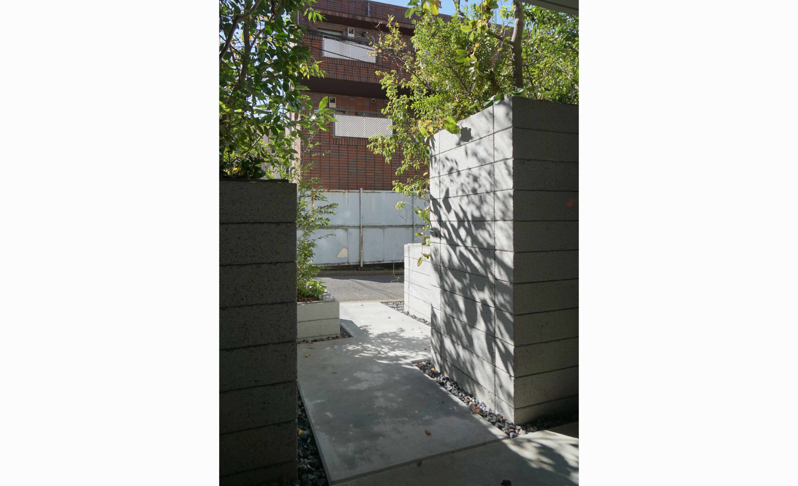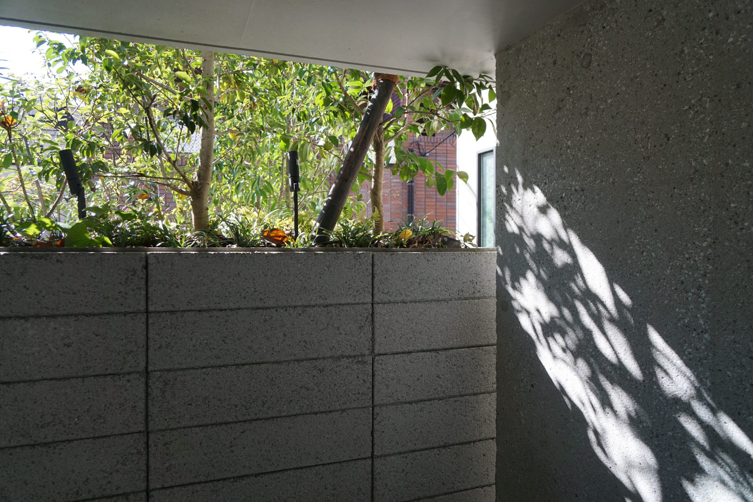 樹々を見上げる植栽ポットの隙間を「谷」と見立てて住宅へのアプローチ動線とし、あえて高さを抑えRCの洗い出しの壁に囲まれたほの暗い印象の玄関へと入っていきます。