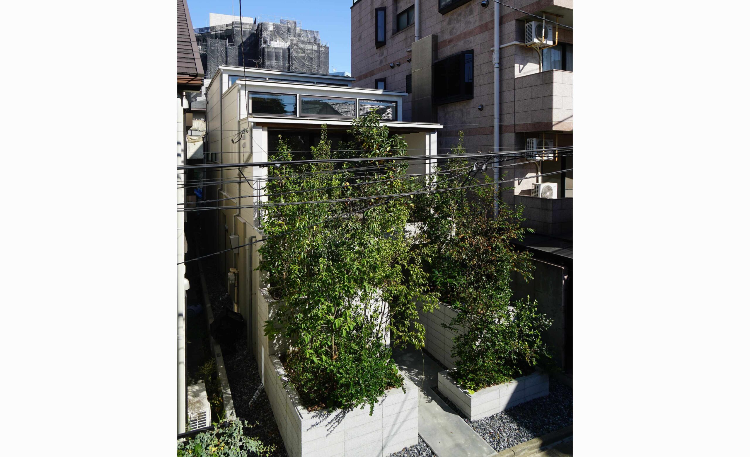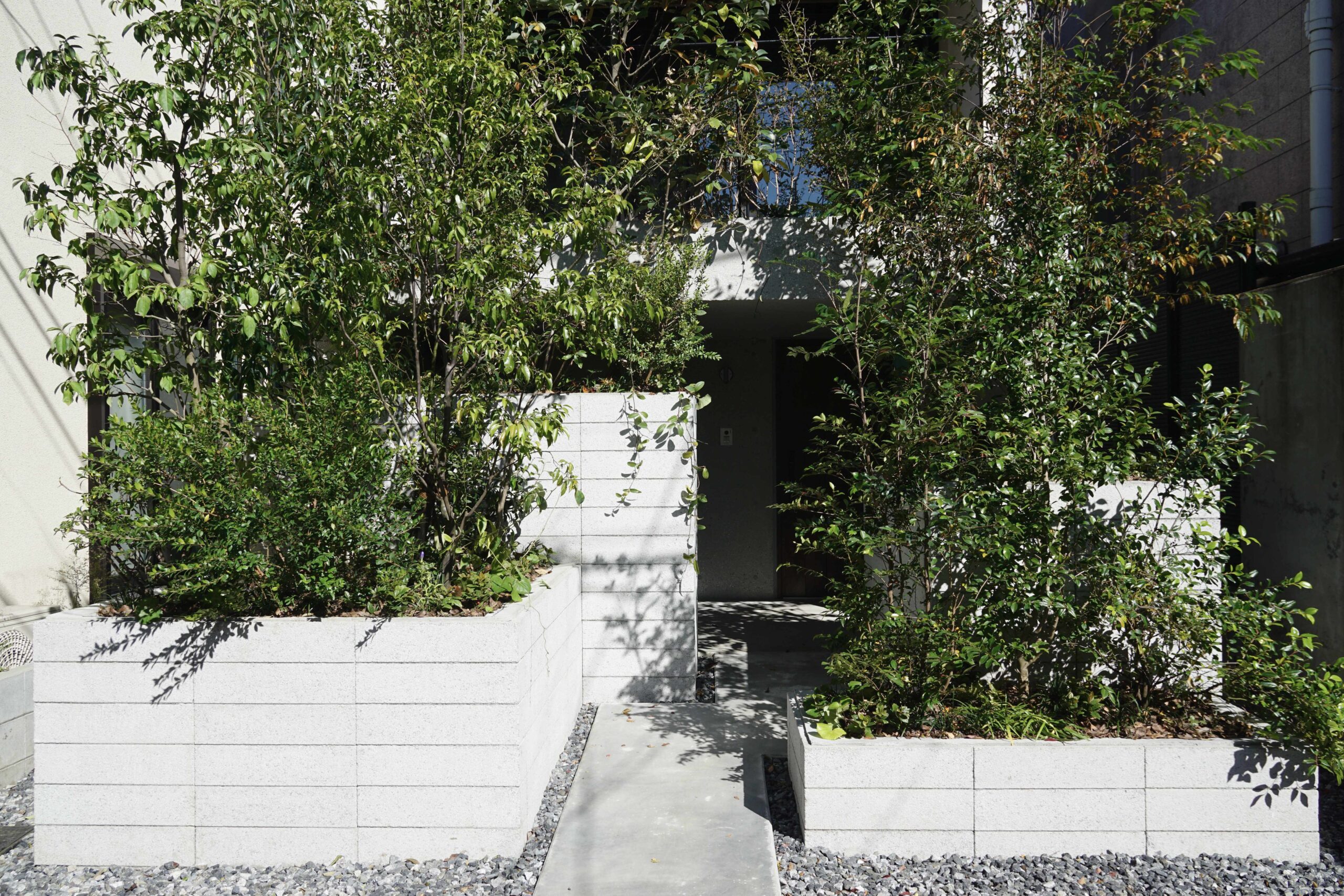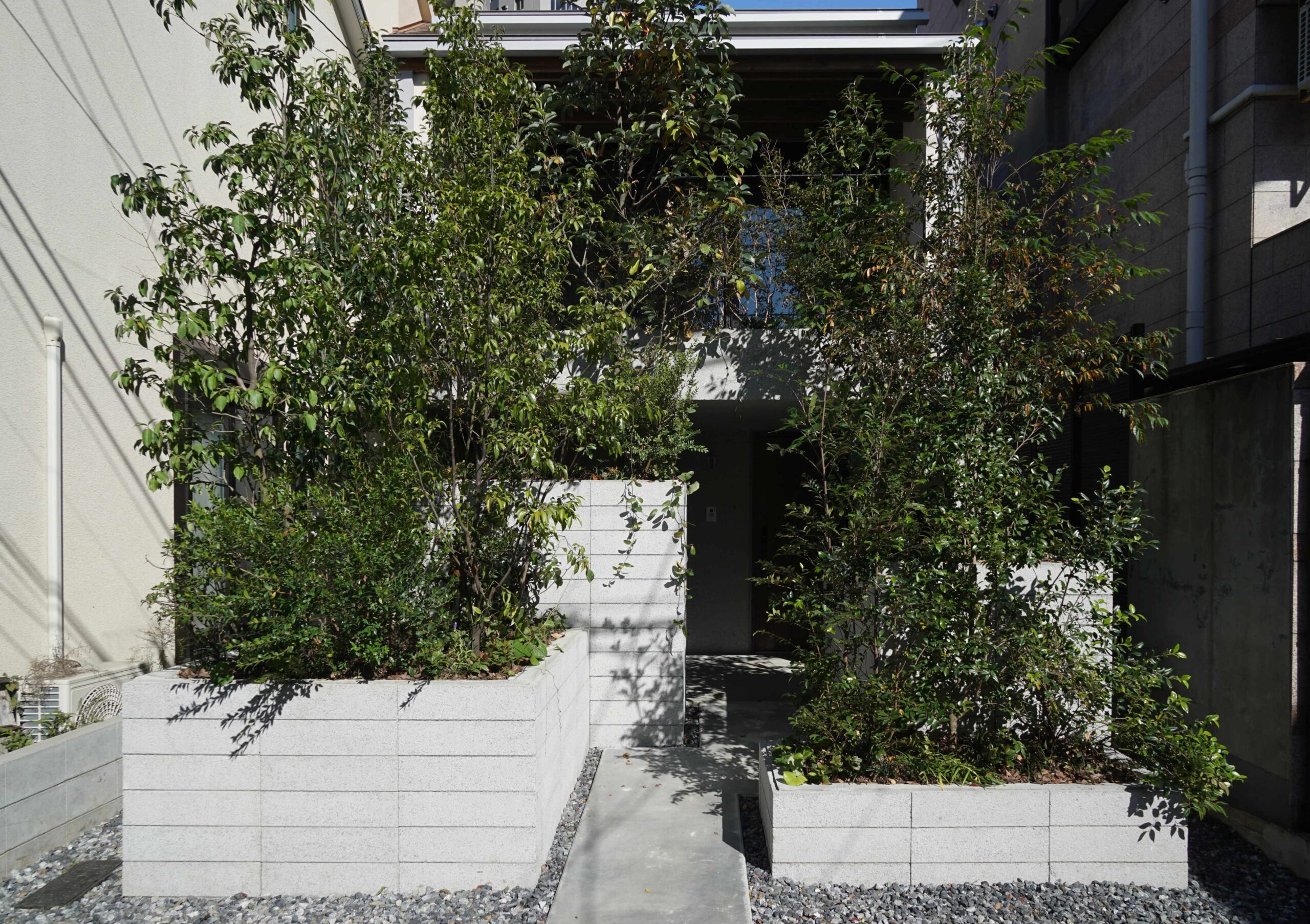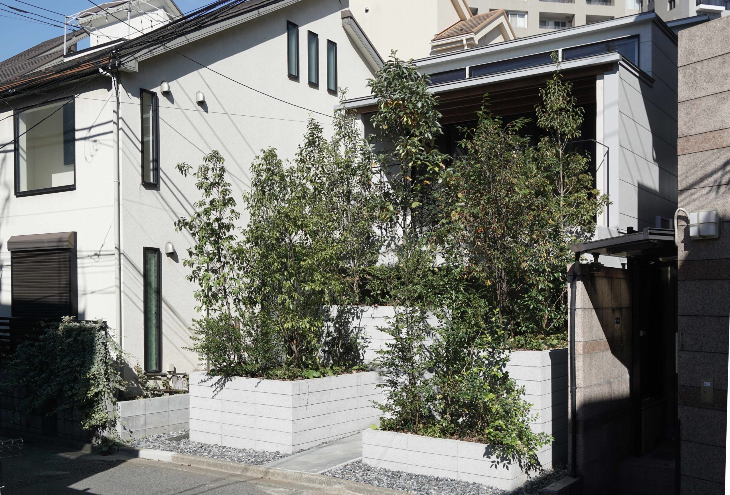 我々は、間口が狭く奥行が長い敷地に対して、接道面に植栽ポットを一層分立ち上げる提案を行いました。