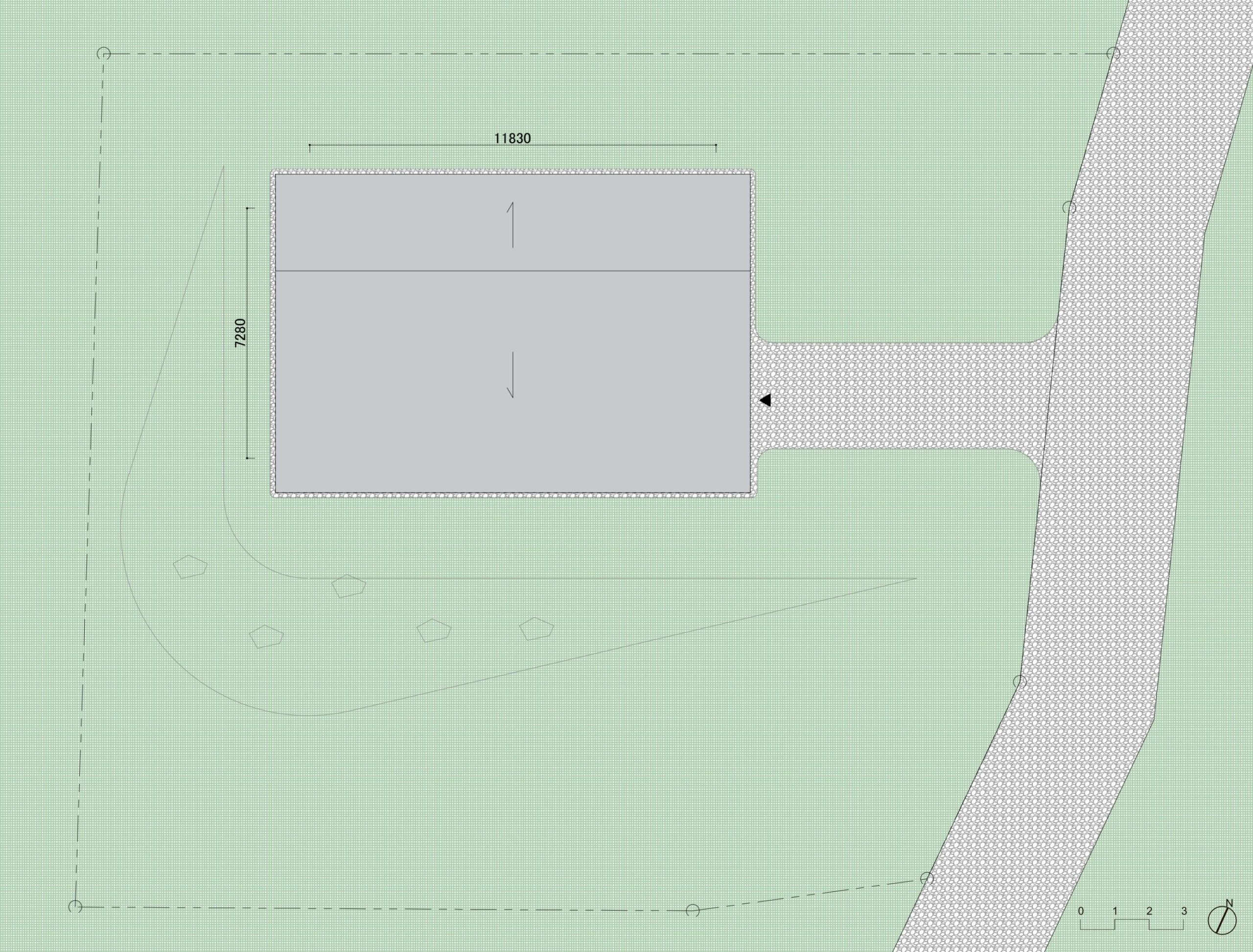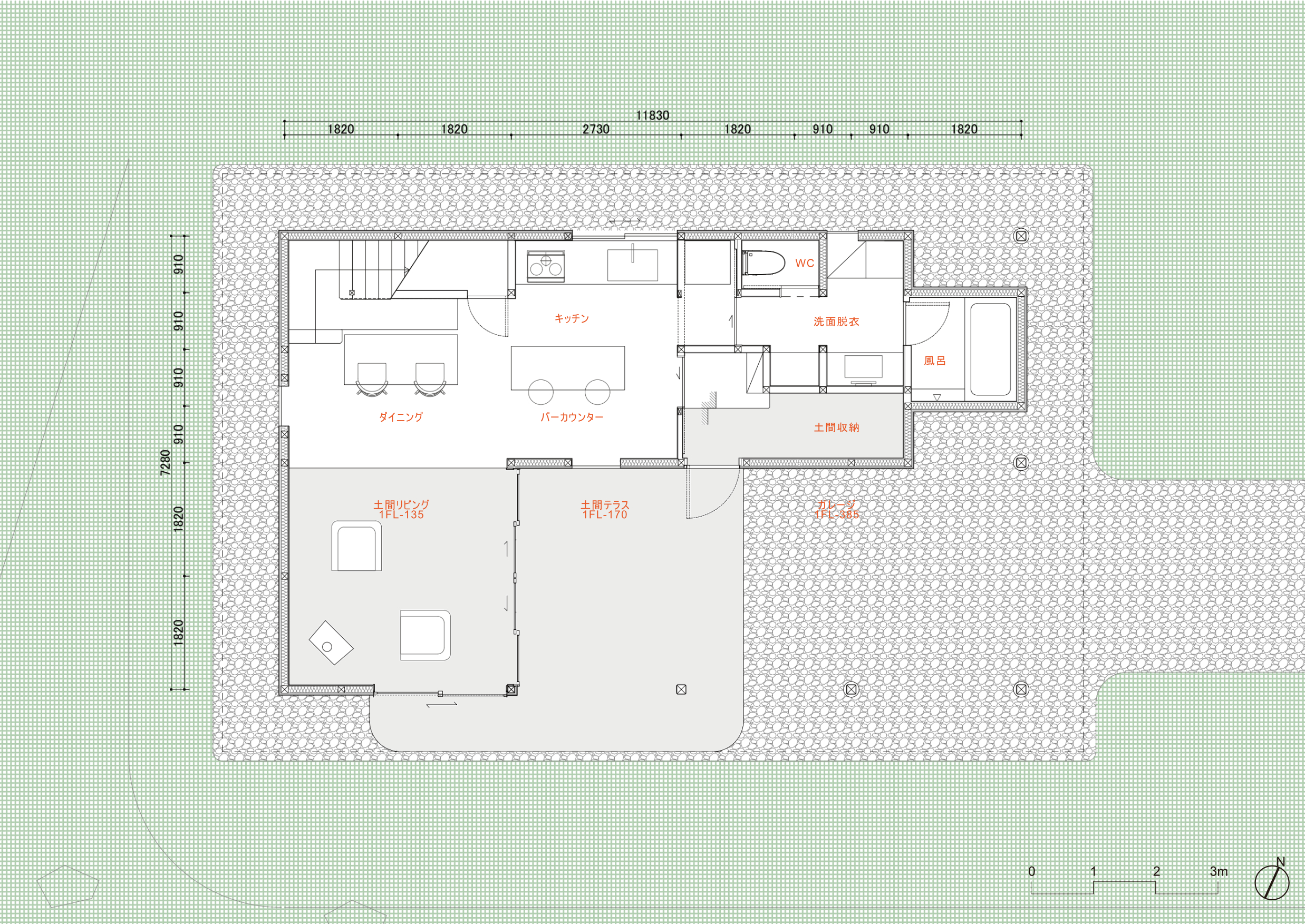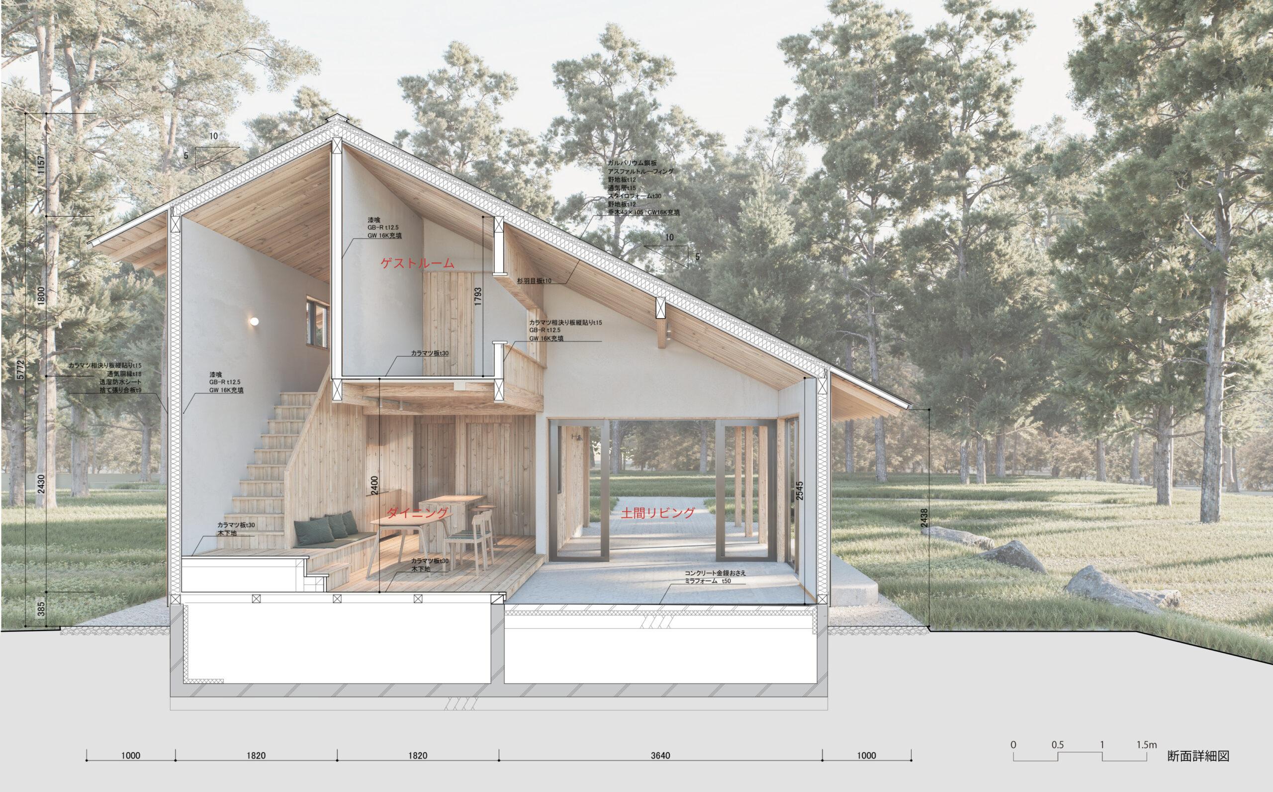 そこで、建物全体に大きな屋根をかけ、建築の南側半分を、駐車スペースから土間テラス、薪ストーブのある土間リビングまで一直線に連続させる計画としました。日常的には屋根の下に余裕をもって駐車できるスペースがあり、天候に左右されず荷物の出し入れをスムーズに行うことが可能です。一方で、晴れた日や人を招く際には、土間リビングの建具を開け放ち、室内外を横断した活動を可能にする可変性の高い軒下空間となります。