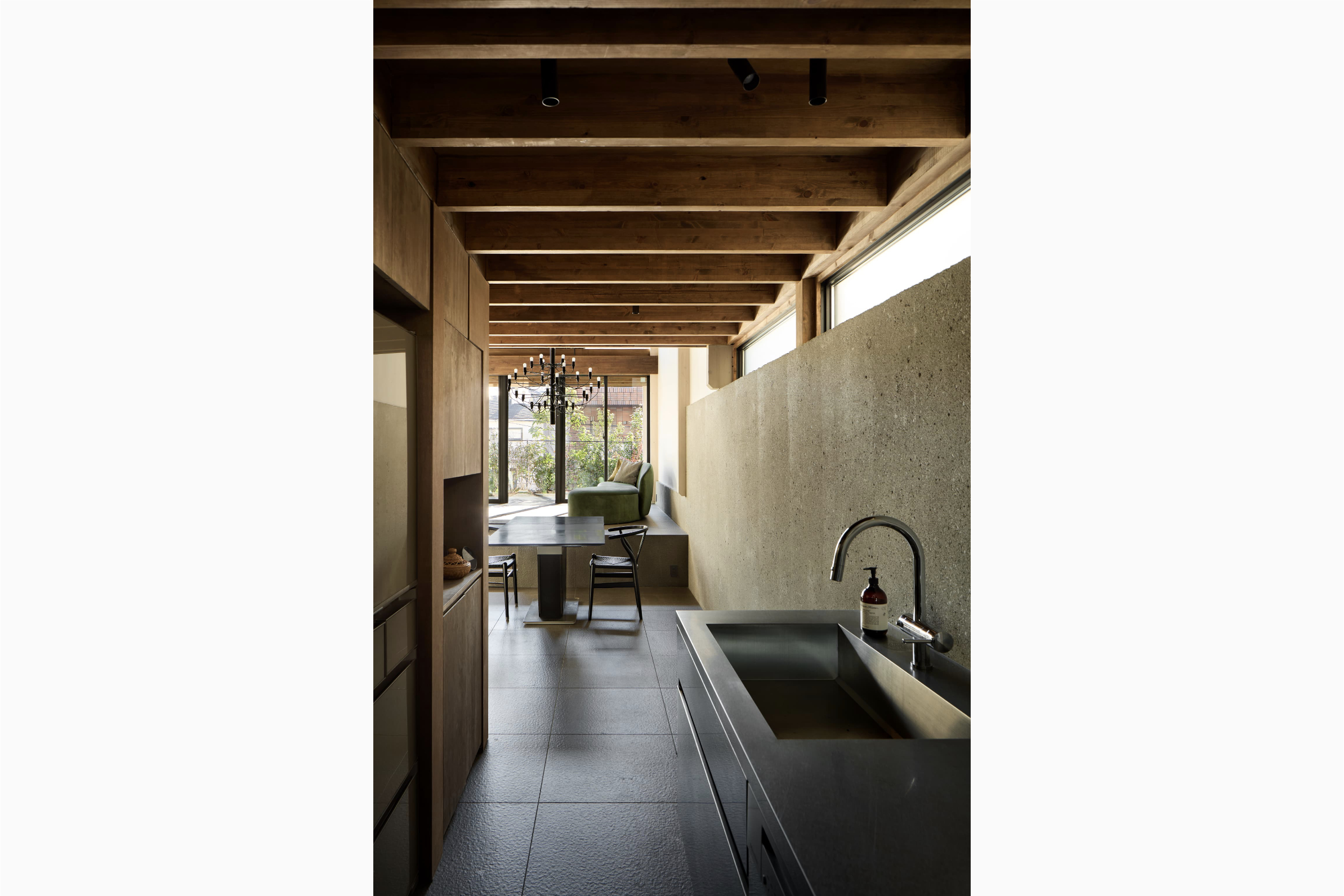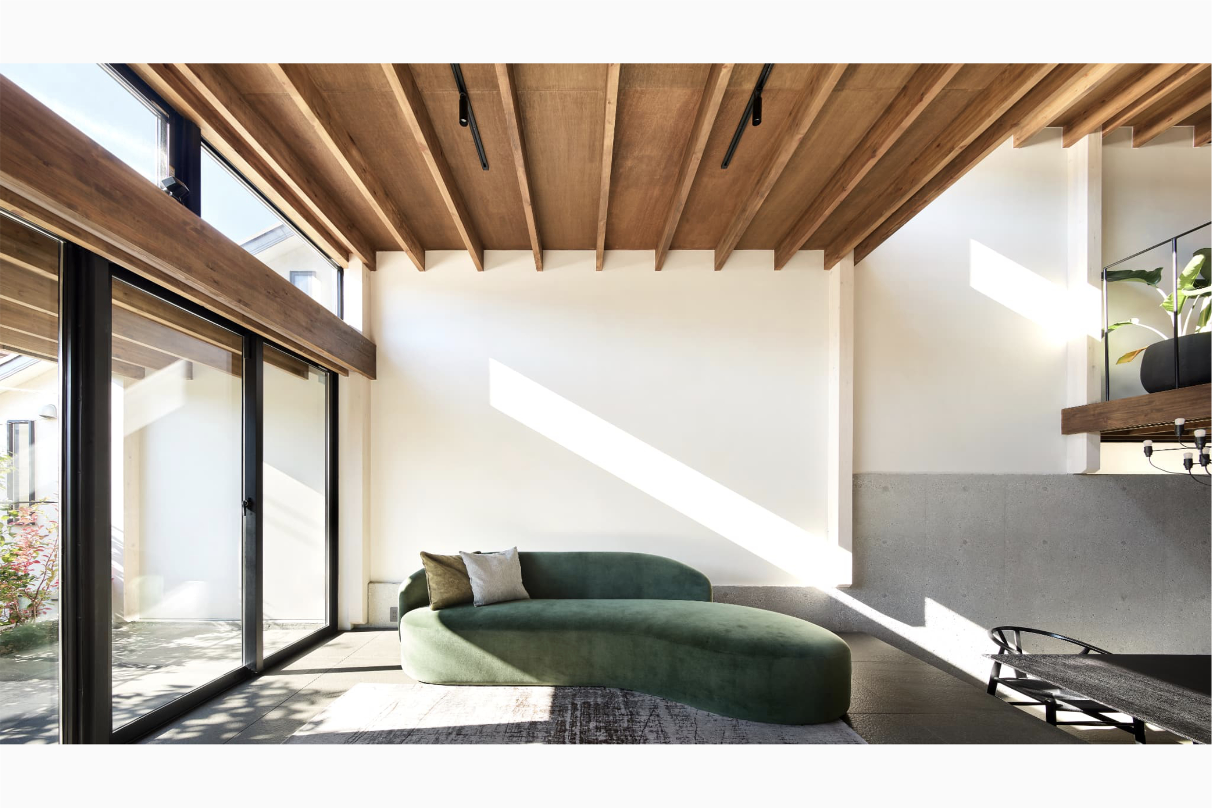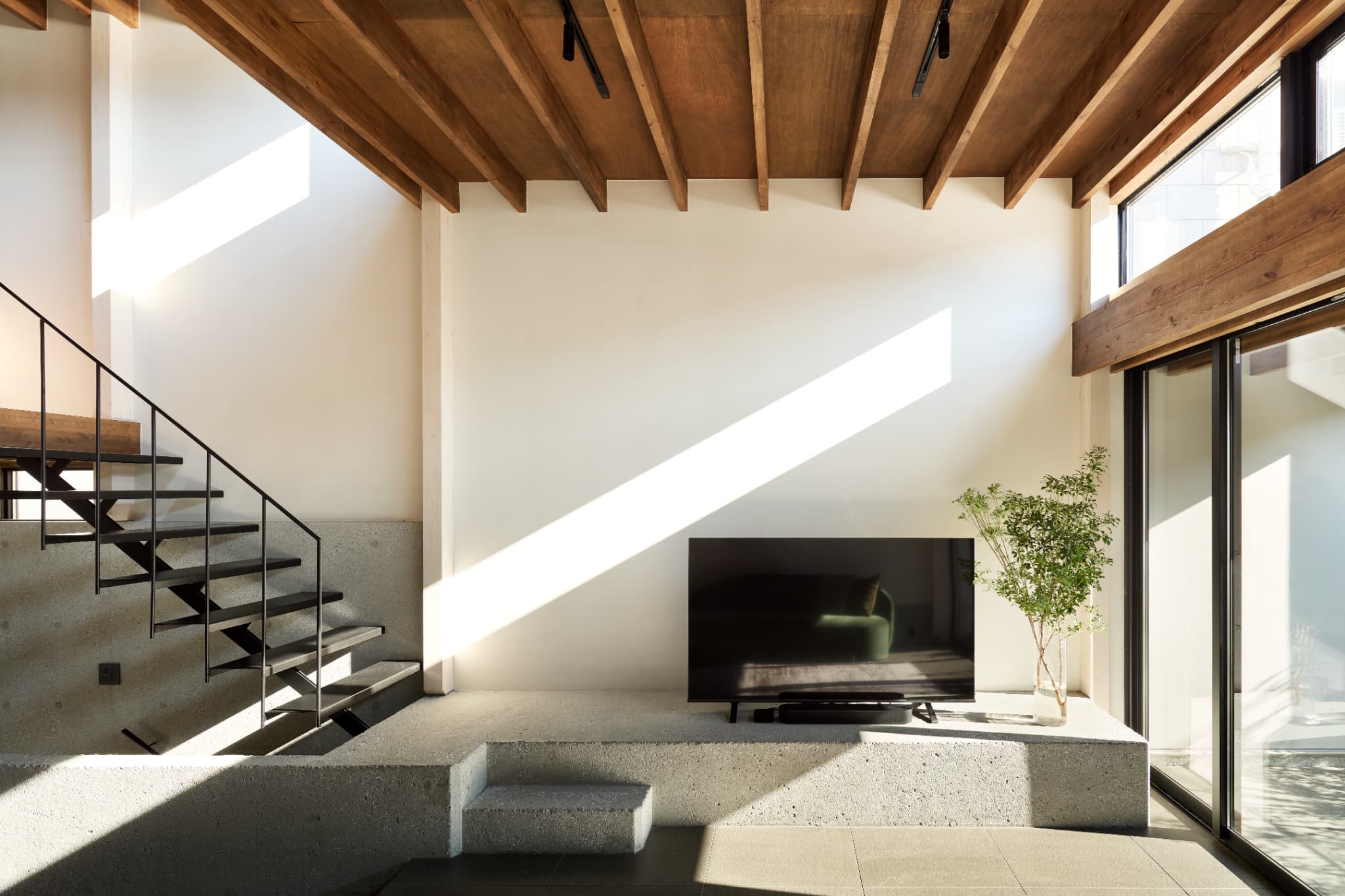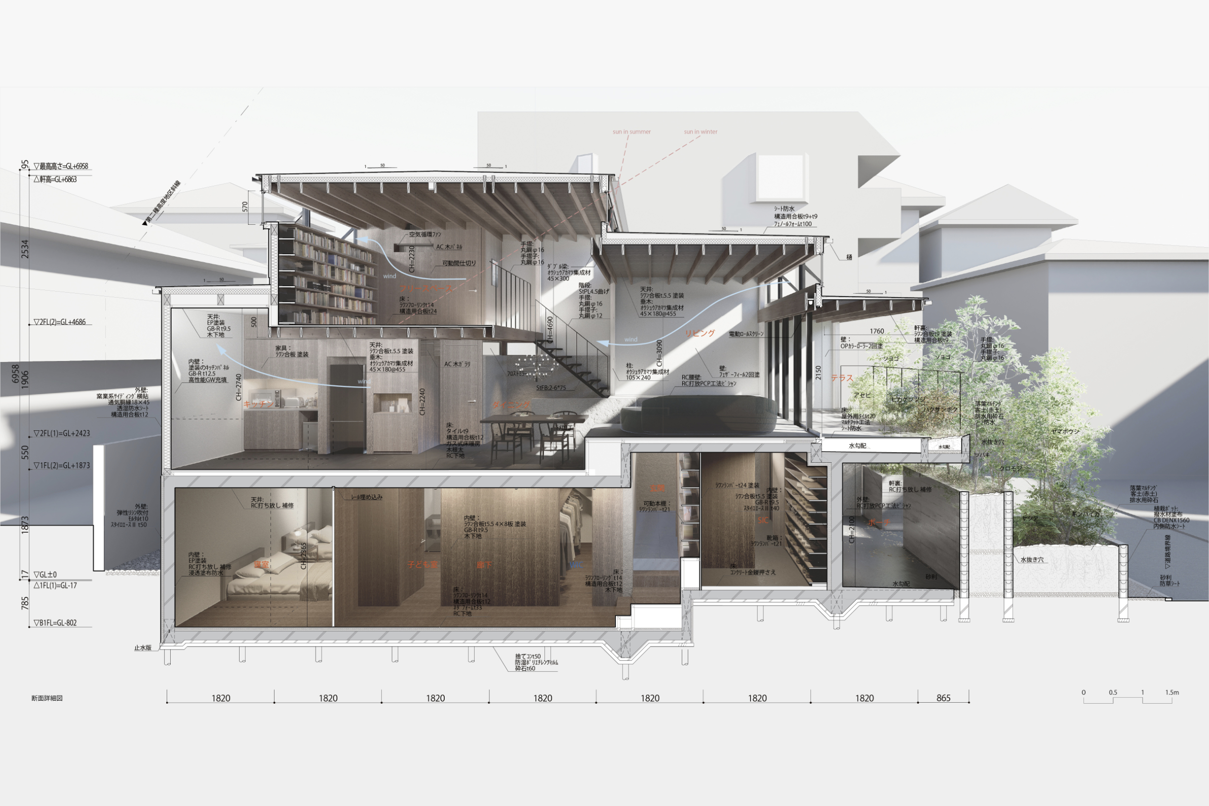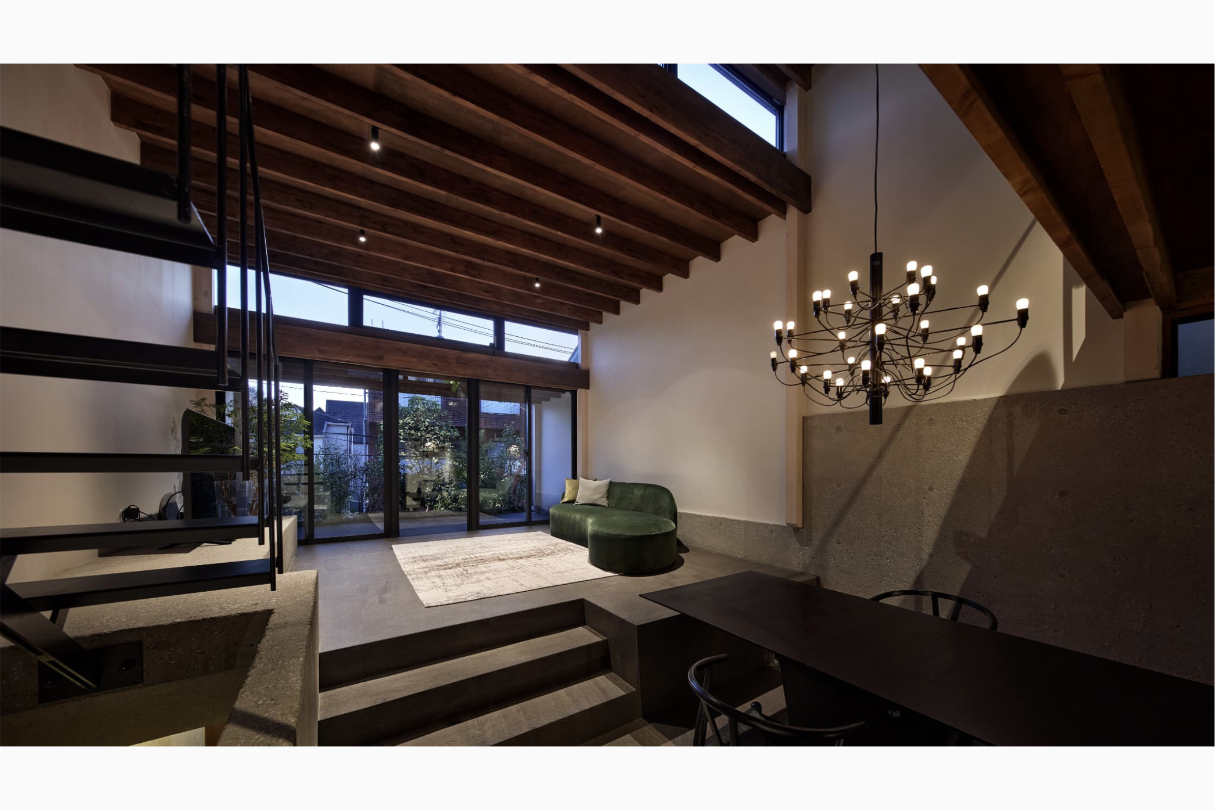 四段に架かる屋根とハイサイドライトの断面寸法は、夏季の直射日光を遮りつつ、冬季の陽光のみを室内深くまで導くよう計画されている。通り抜ける風や刻々と変化する光の濃淡が室内に満ち、生活の中で四季の機微を鮮やかに感じ取れる環境が整えられている。
