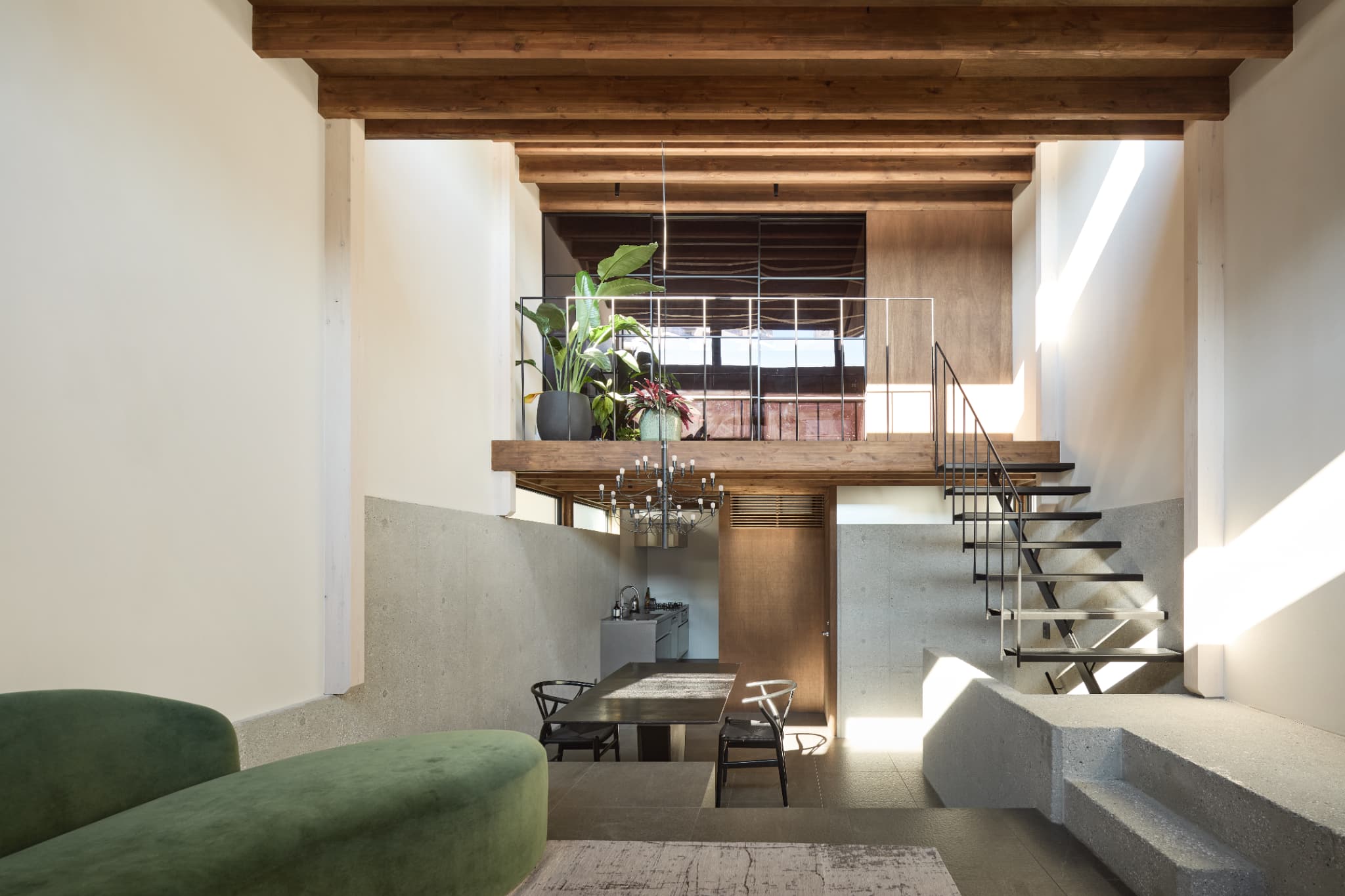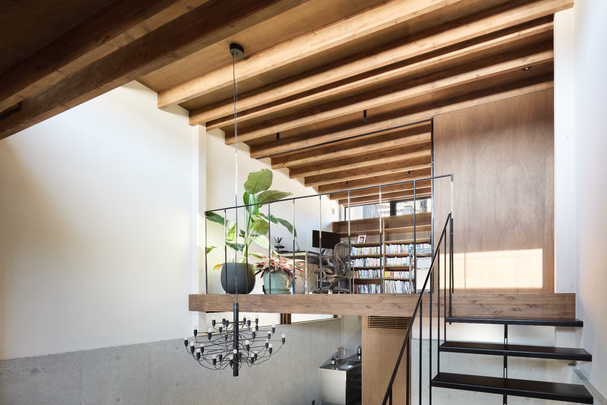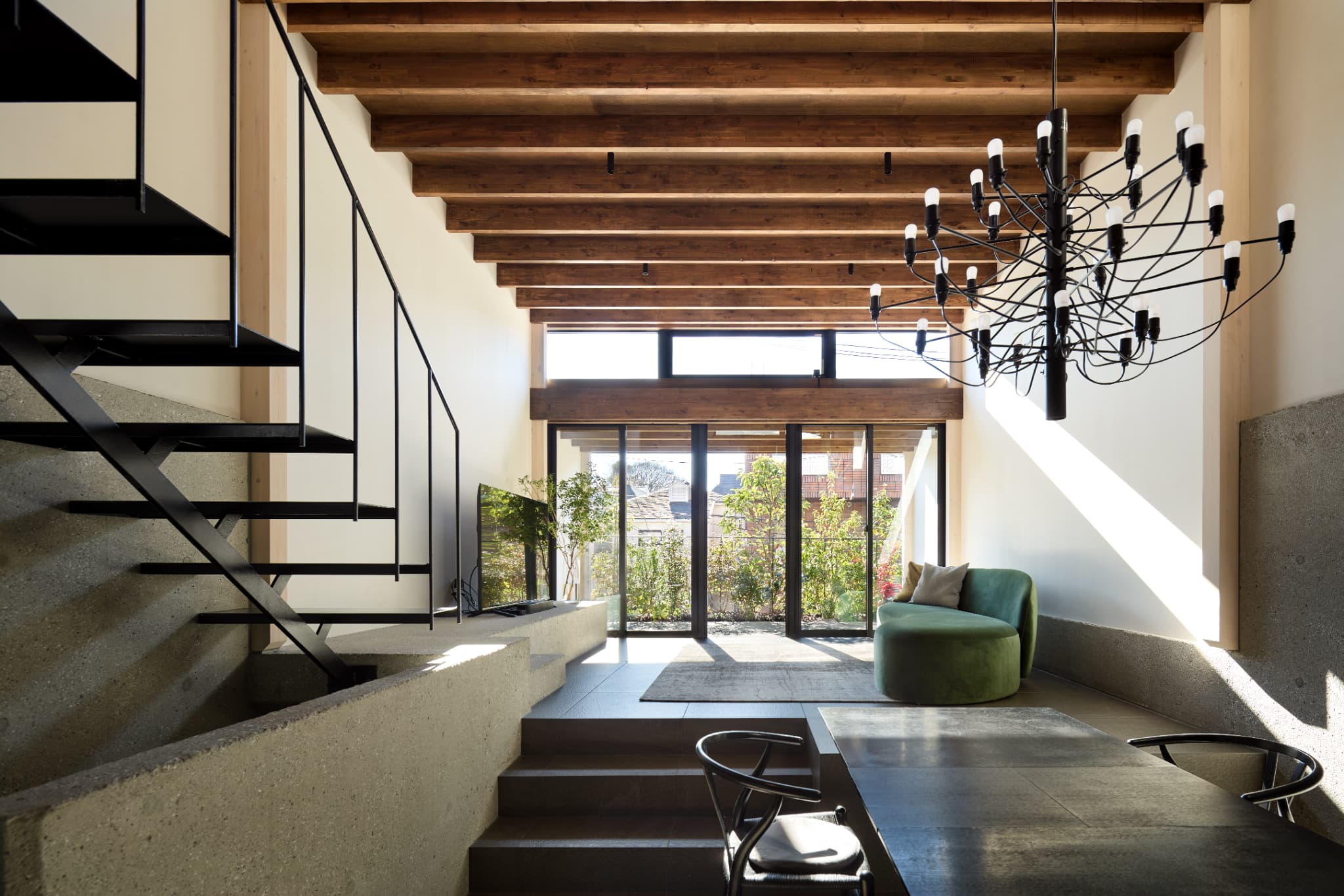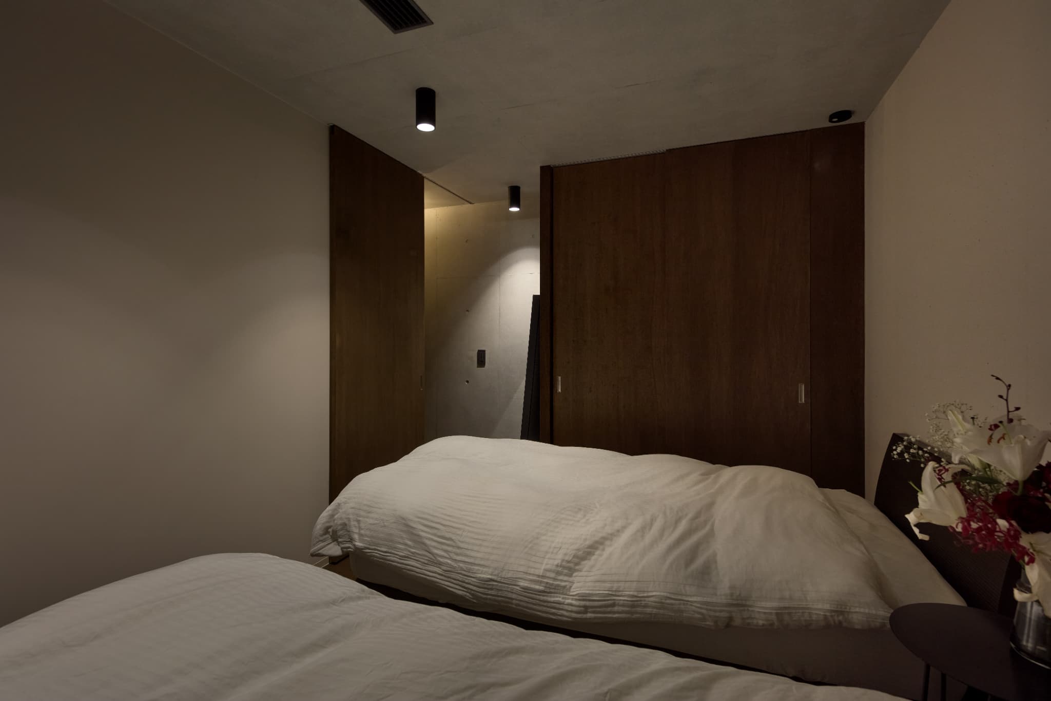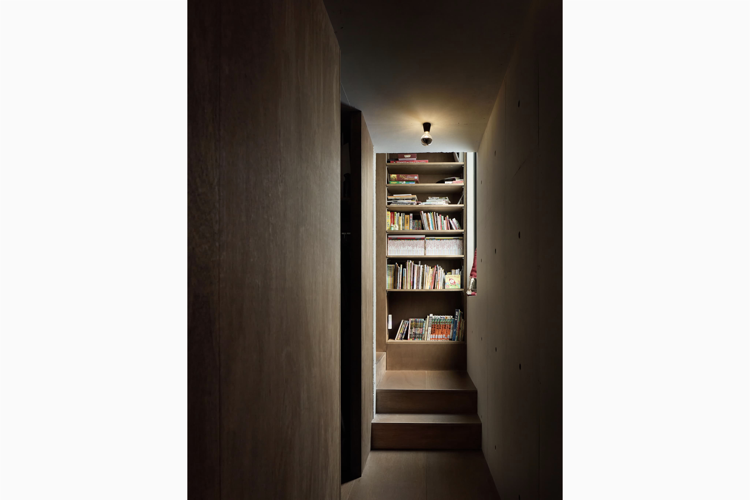 四段に架かる屋根とハイサイドライトの断面寸法は、夏季の直射日光を遮りつつ、冬季の陽光のみを室内深くまで導くよう計画されている。通り抜ける風や刻々と変化する光の濃淡が室内に満ち、生活の中で四季の機微を鮮やかに感じ取れる環境が整えられている。