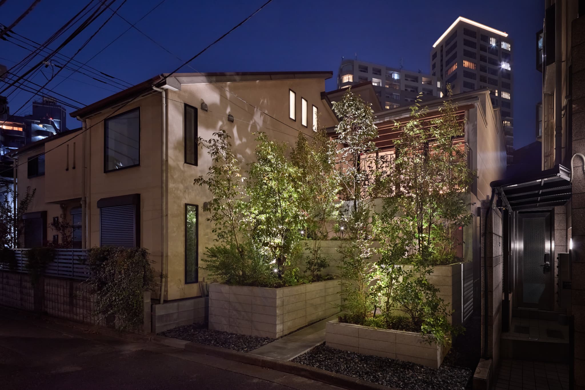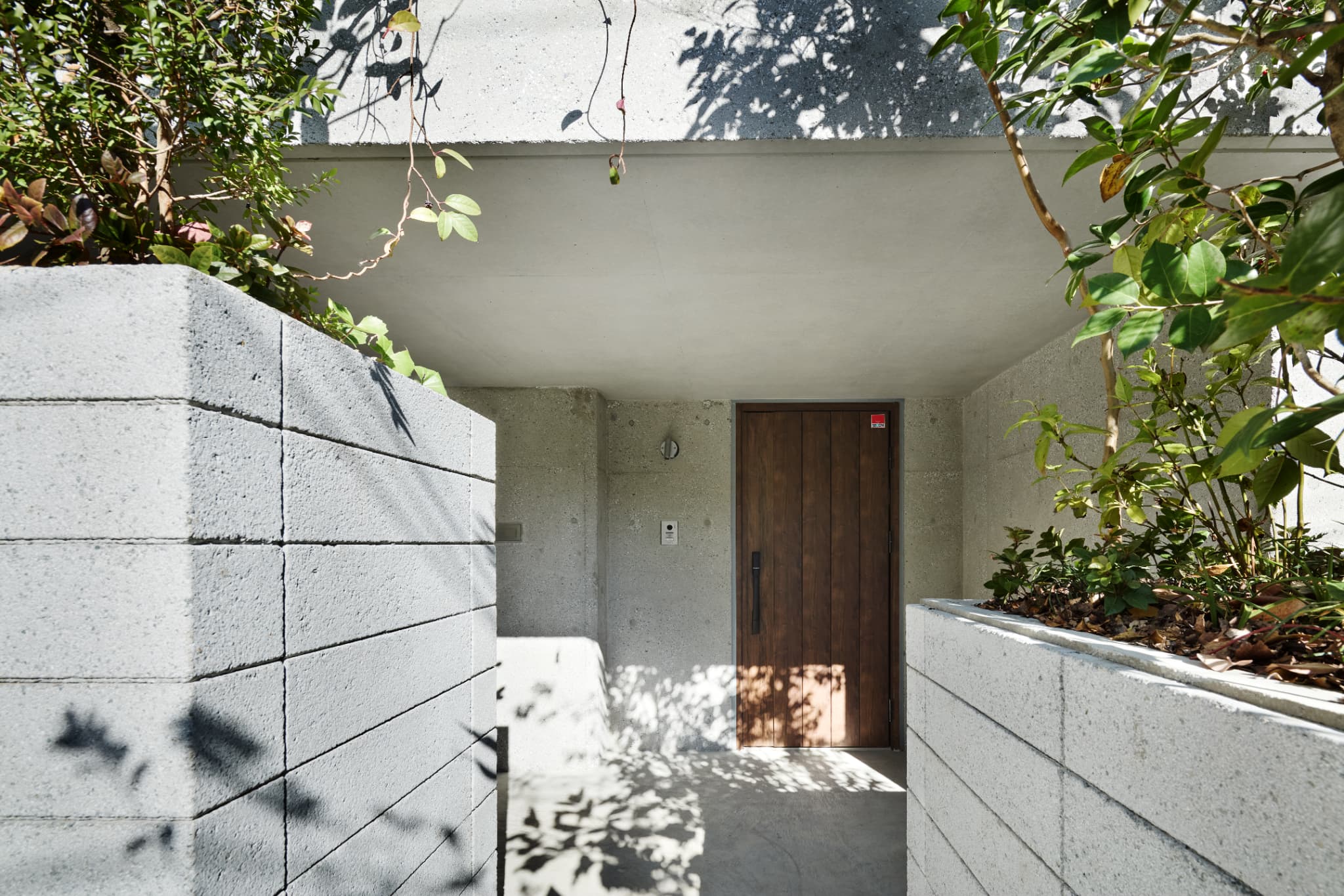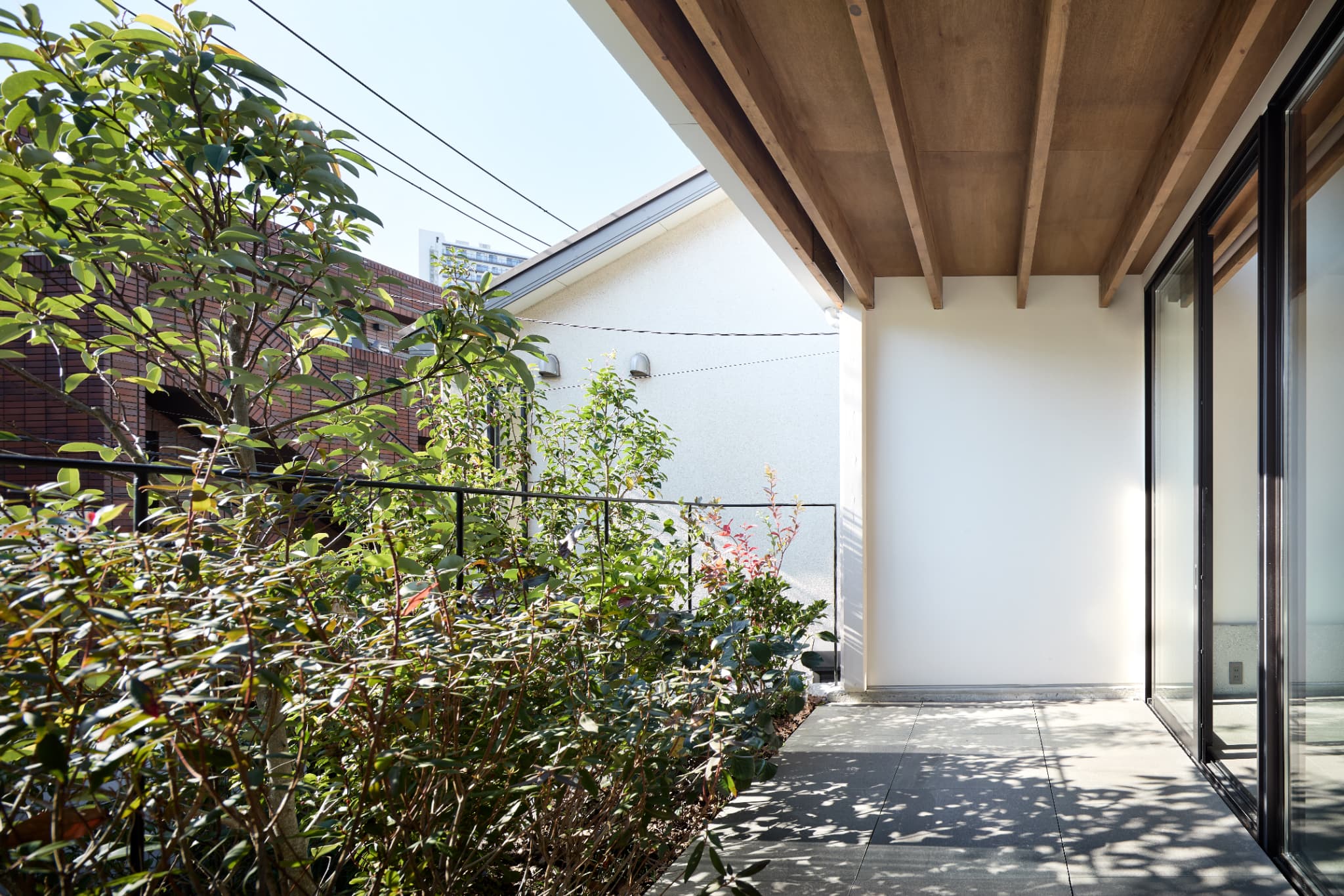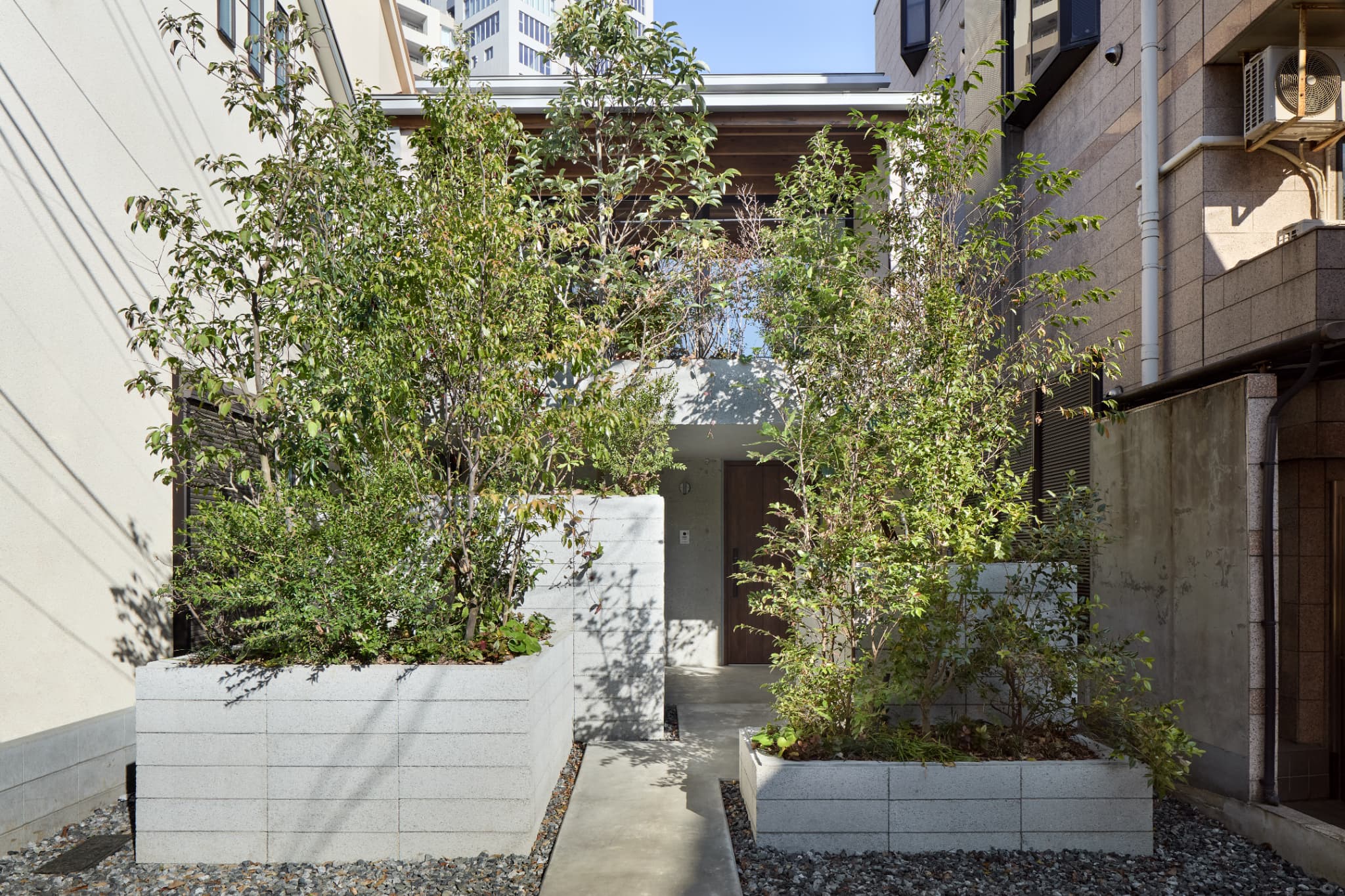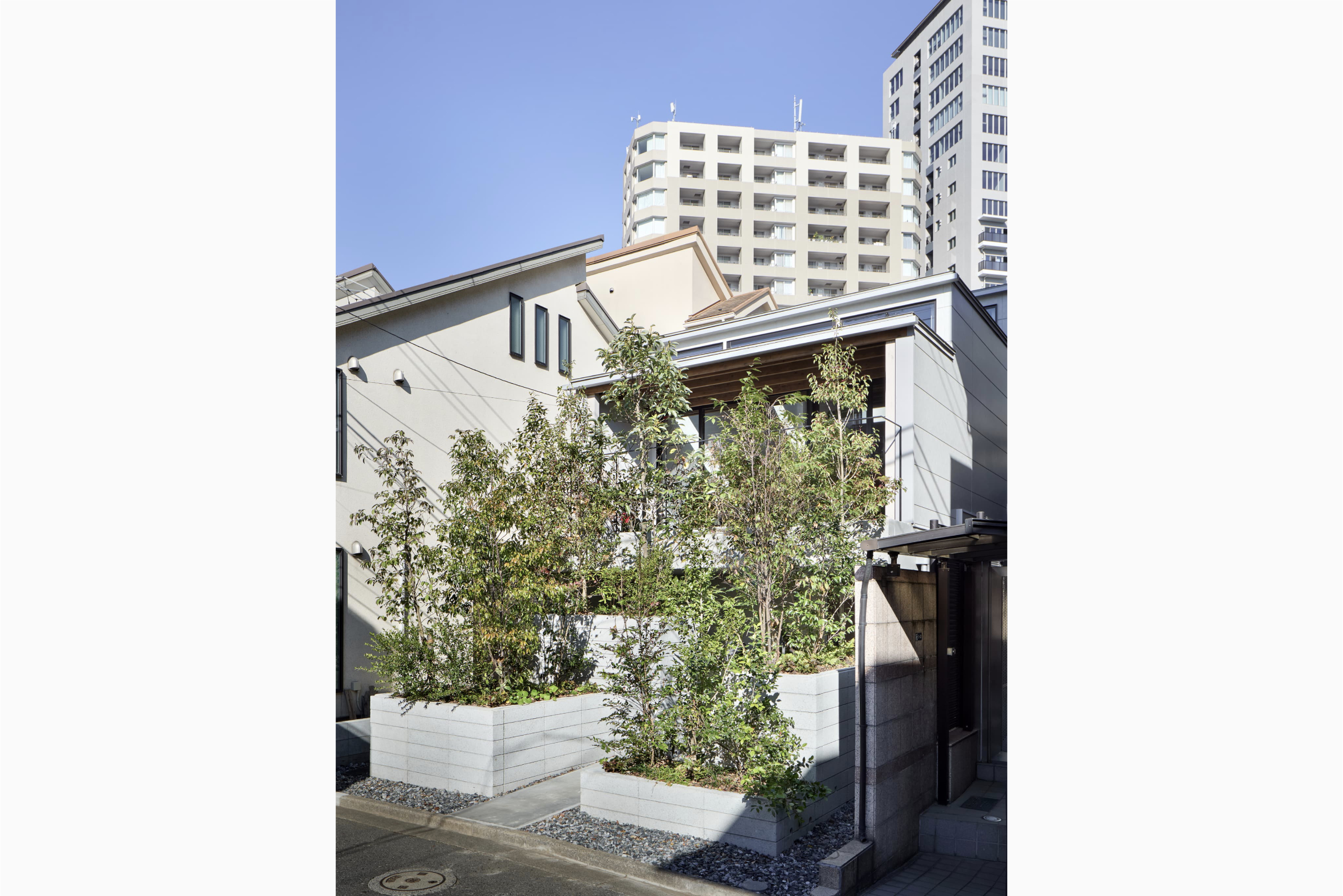 植栽計画においては、日本文学に造詣が深い建主のために、在来種を中心とした多様な常緑樹を用い、茶庭をイメージした落ち着きのある庭とした。テラス先端の低木植栽帯には潅水設備を用意し、その余剰水を水抜穴から下段のポットへと落とすことで、高さの変化を利用した水の流れを作っている。植栽ポットの筐体には建築用のコンクリートブロックを採用し、基礎を含めてロの字型に組積することで、水の浸透性と根の伸展を妨げない構造としている。コンクリートブロックの擁壁や塀が多く存在する既存の風景に馴染む素材を用いながら、その段状の重なりによって、独自の表情を作り出した。