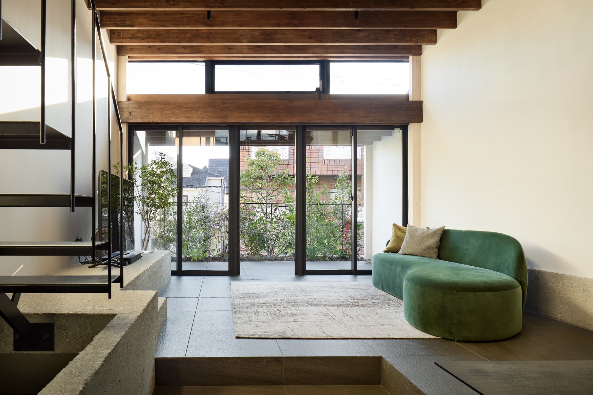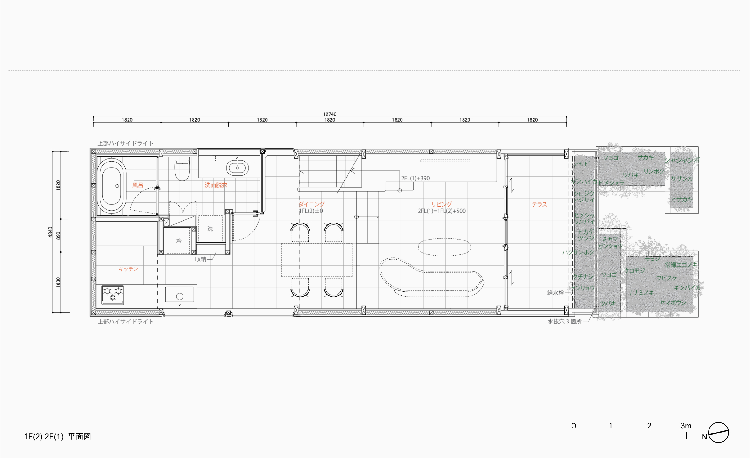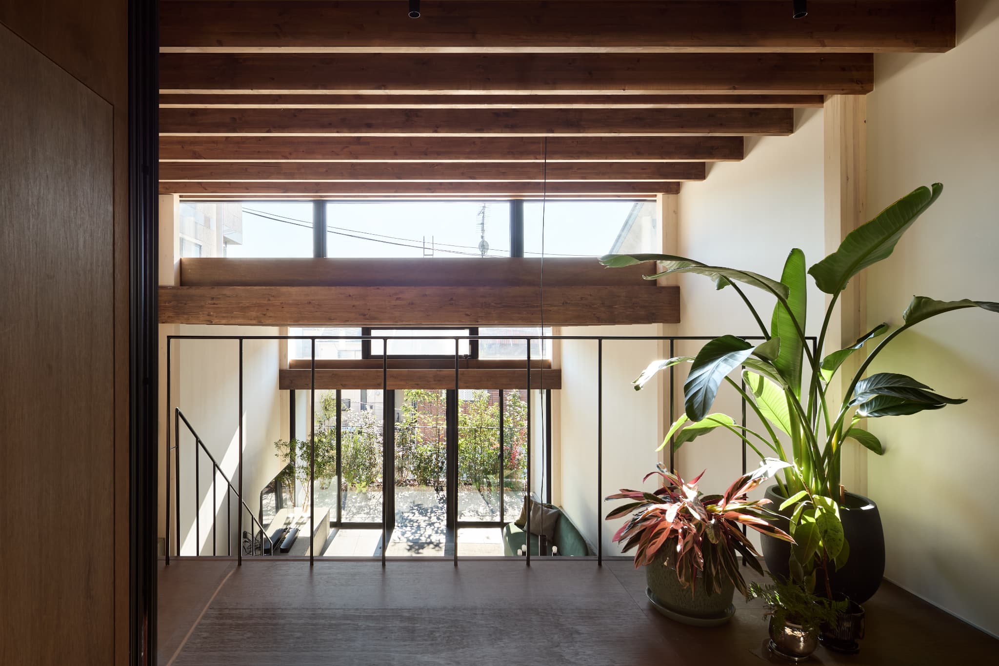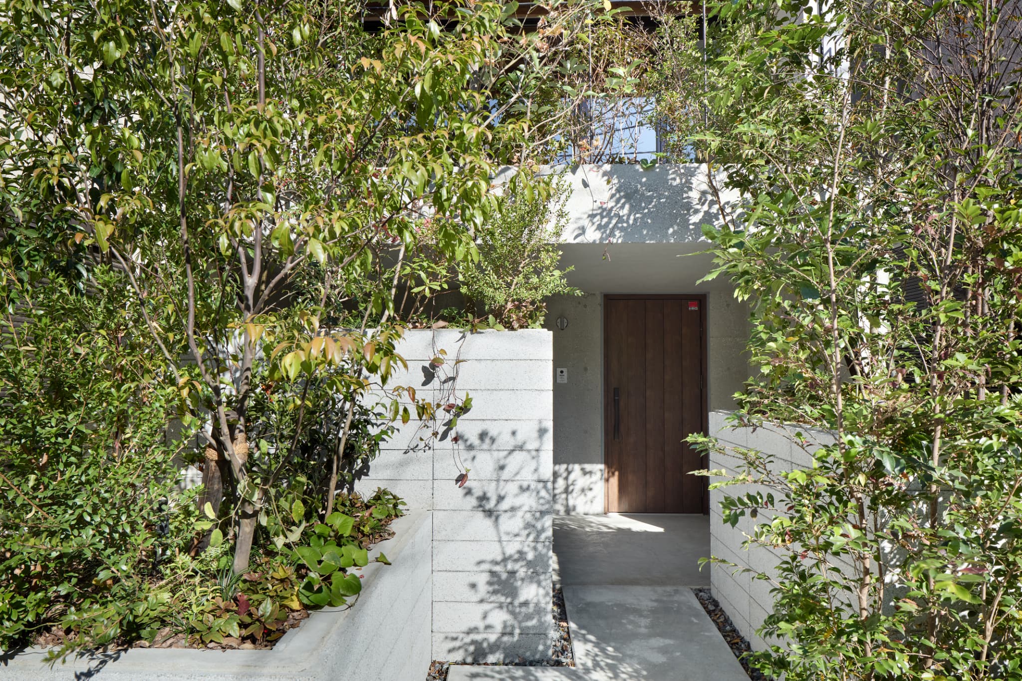 間口が狭く奥行の深い敷地に対し、接道面には高さを四段階に変えた植栽ポットを、層を成すようにずらしながら配置した。常緑樹を主体とした植栽は、街路に対する柔らかな緑のファサードを形成すると同時に、室内へのプライバシーを守るバッファとして機能する。 樹々を見上げる植栽ポットの隙間を「谷」に見立てて雁行するアプローチ動線とし、あえて天井高さを抑えたほの暗い玄関へと導く。上部から差し込む光に誘われて階段を上がると、植栽ポットのレベル差が生み出す立体的な緑の重なりを望む、「丘」の上のような明るく開放的な空間が広がる。
