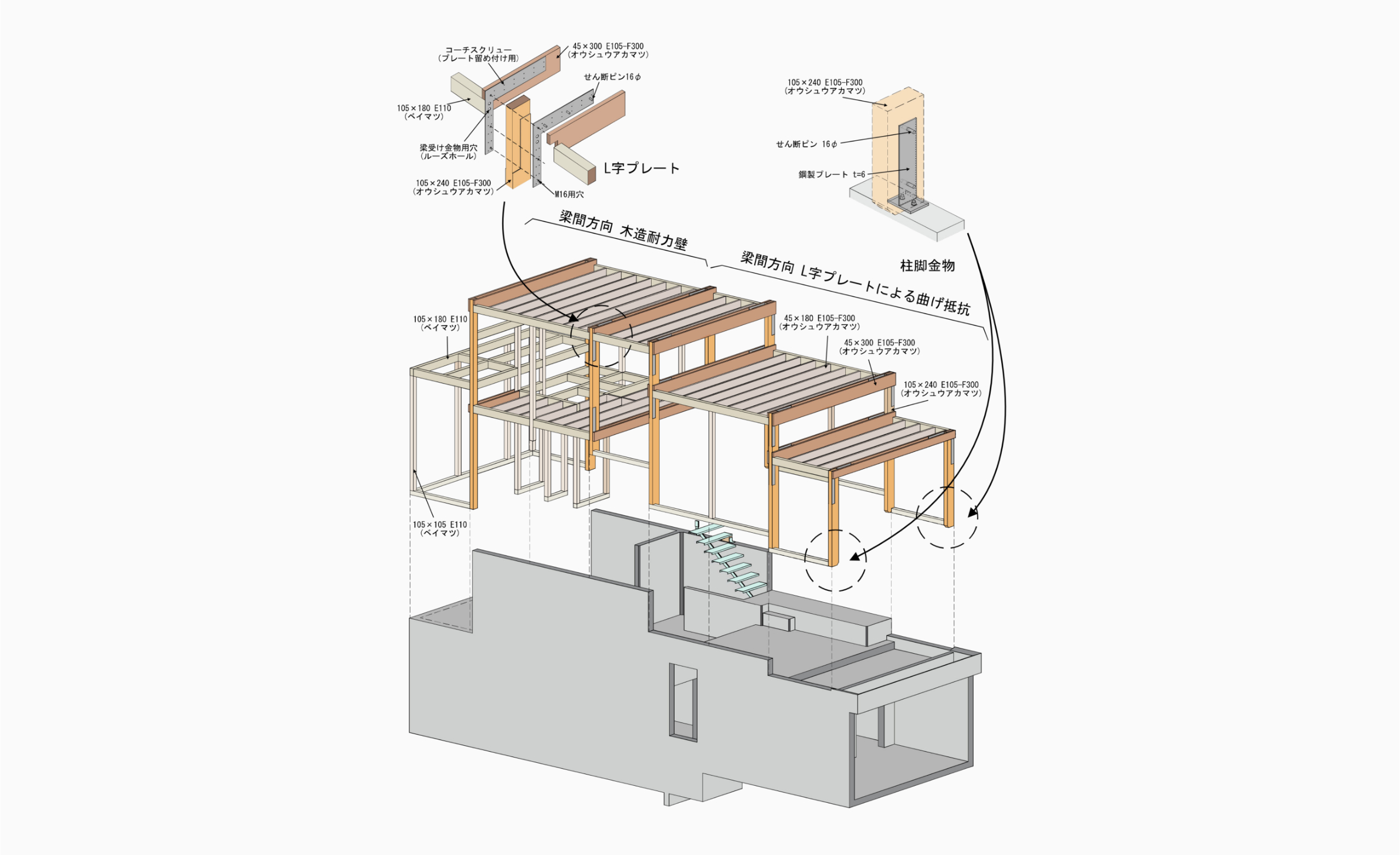 ラーメン架構を構成する部材はオウシュウアカマツ集成材を用い、柱(105×240mm)に対し、梁(2-45×180mm/300mm)をダブルで挟み込む構成としている。接合部には6mm厚のL字型鋼製プレートを設け、せん断ピンとボルトによる接合でモーメント抵抗を可能とした。